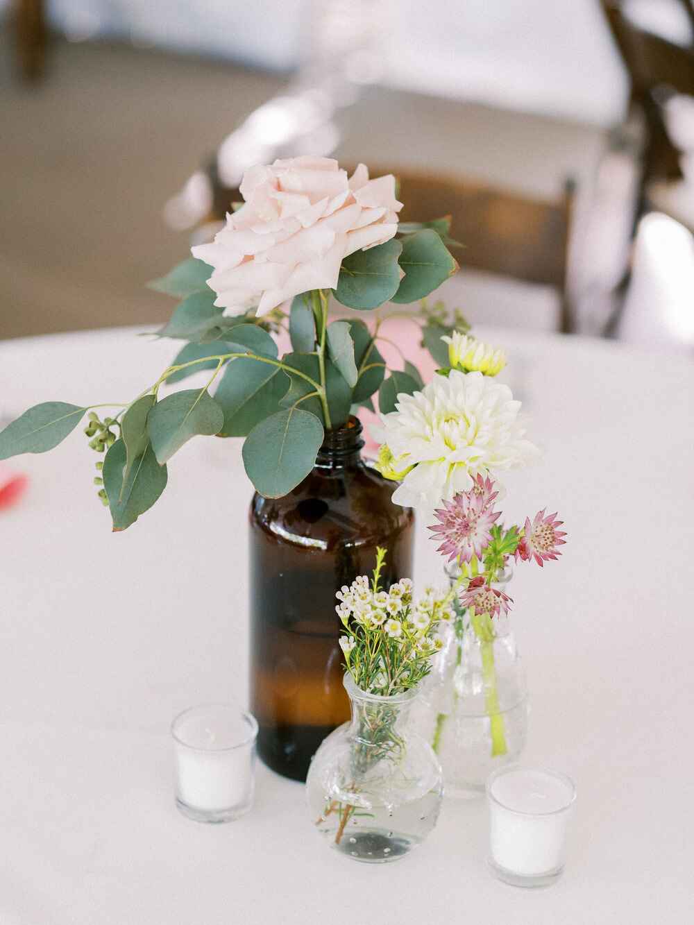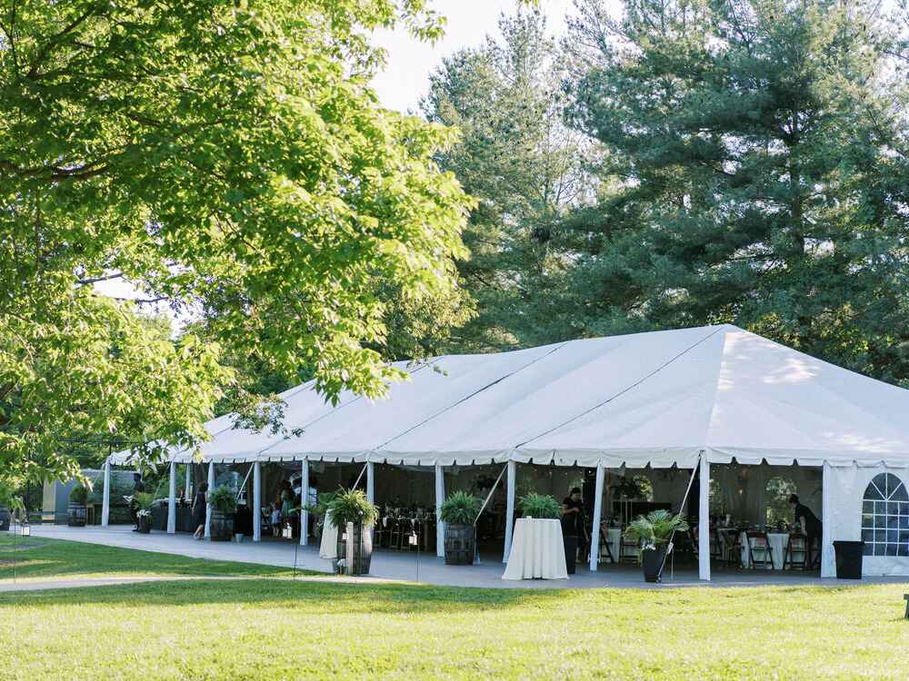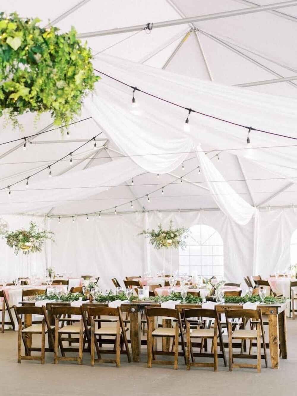 The wedding’s aesthetic was elevated with market lights, drapery, and hanging greenery chandeliers, which softened the look of the tent and created an inviting ambiance. The use of both round and rectangular tables provided ample walking room and a visually appealing setup. Ivory linens and mauve napkins added a touch of elegance that tied the whole look together.
