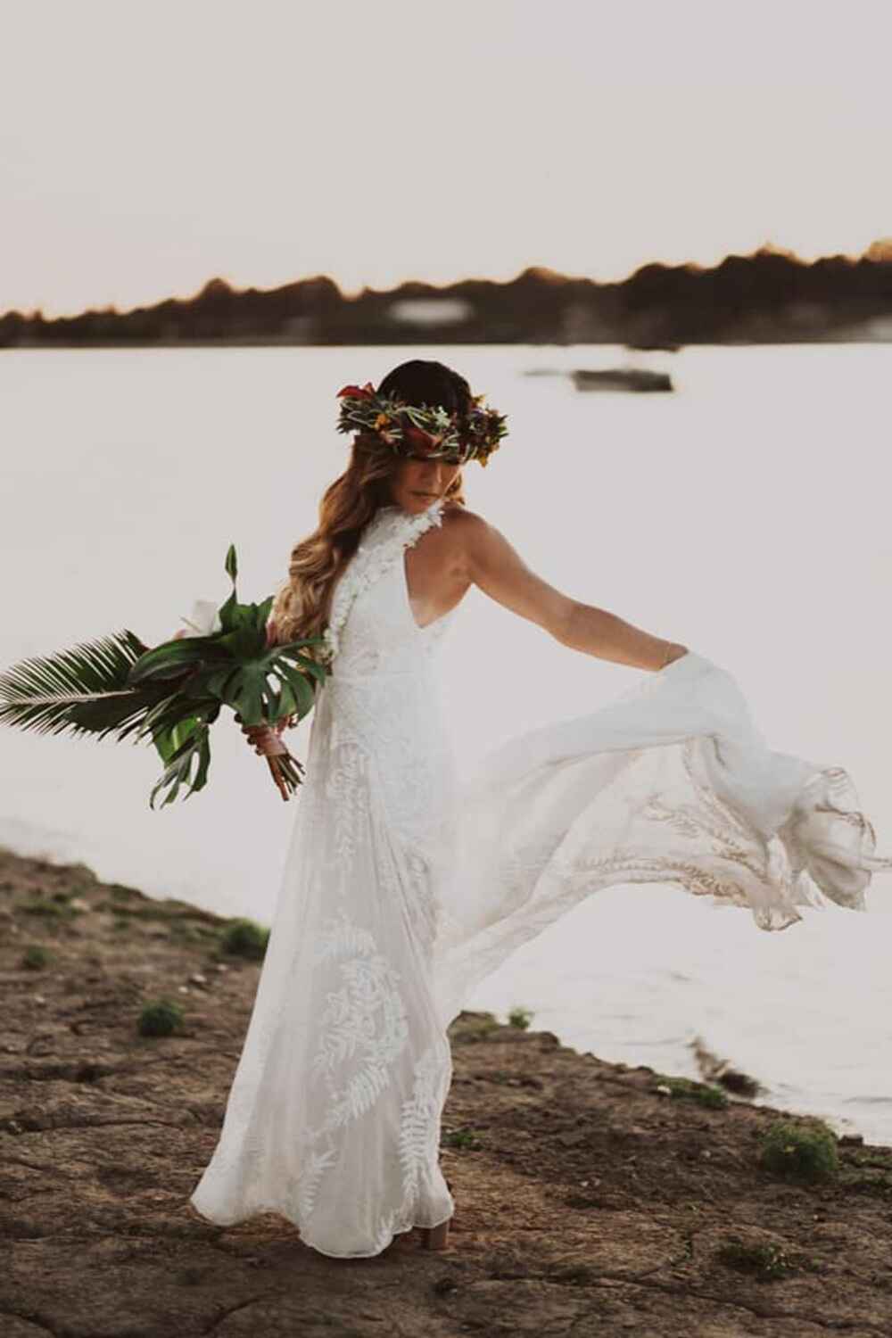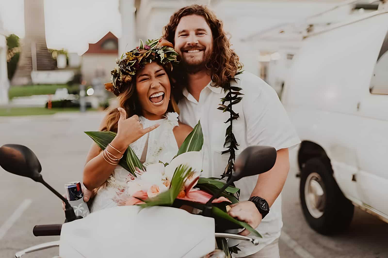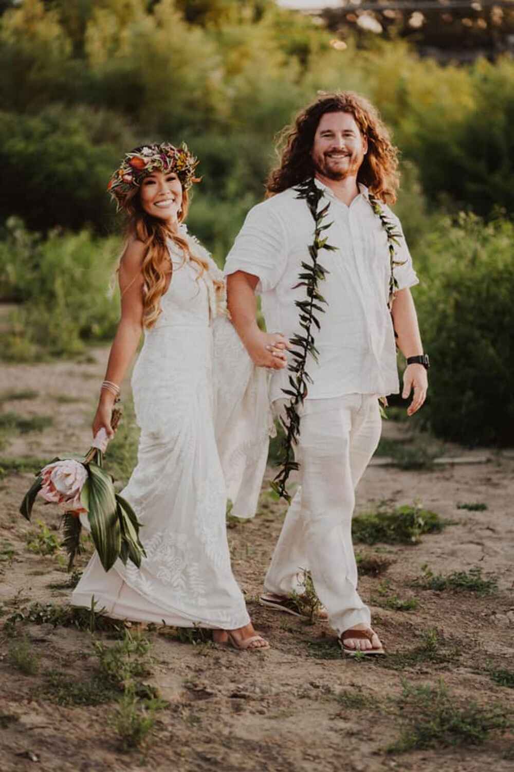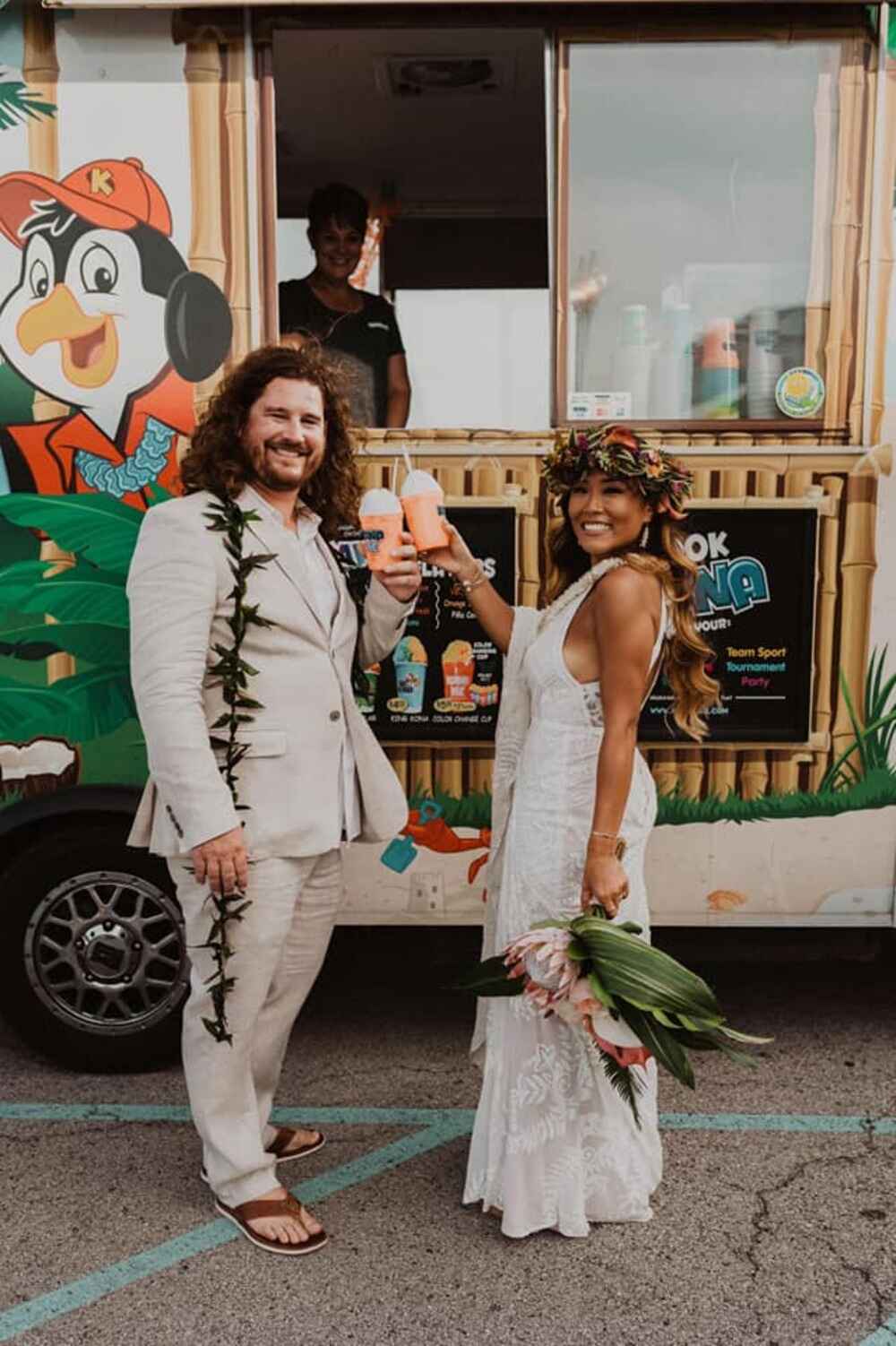 One of the standout elements was Stephanie’s floral head dress, a stunning piece created in place of a traditional veil. This unique accessory added a personal and beautiful touch to her bridal look, making her feel like a Hawaiian princess on her special day.