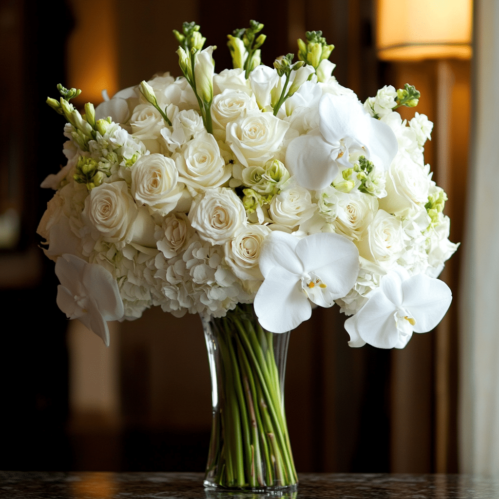 Why Itโs Trending: A single-color floral theme creates an elegant, cohesive look. Popular Choices: All-white arrangements or single-hue designs with roses, lilies, and orchids. Best for: Luxury weddings and timeless Louisville wedding aesthetics.